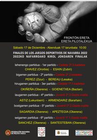 El pasado sábado 17 de diciembre se disputaron en el frontón Ereta por primera vez las finales de juegos deportivos de Navarra. Nafarroako kirol Jokoen finalak. En esta ocasión en categorías de cadete y juvenil.